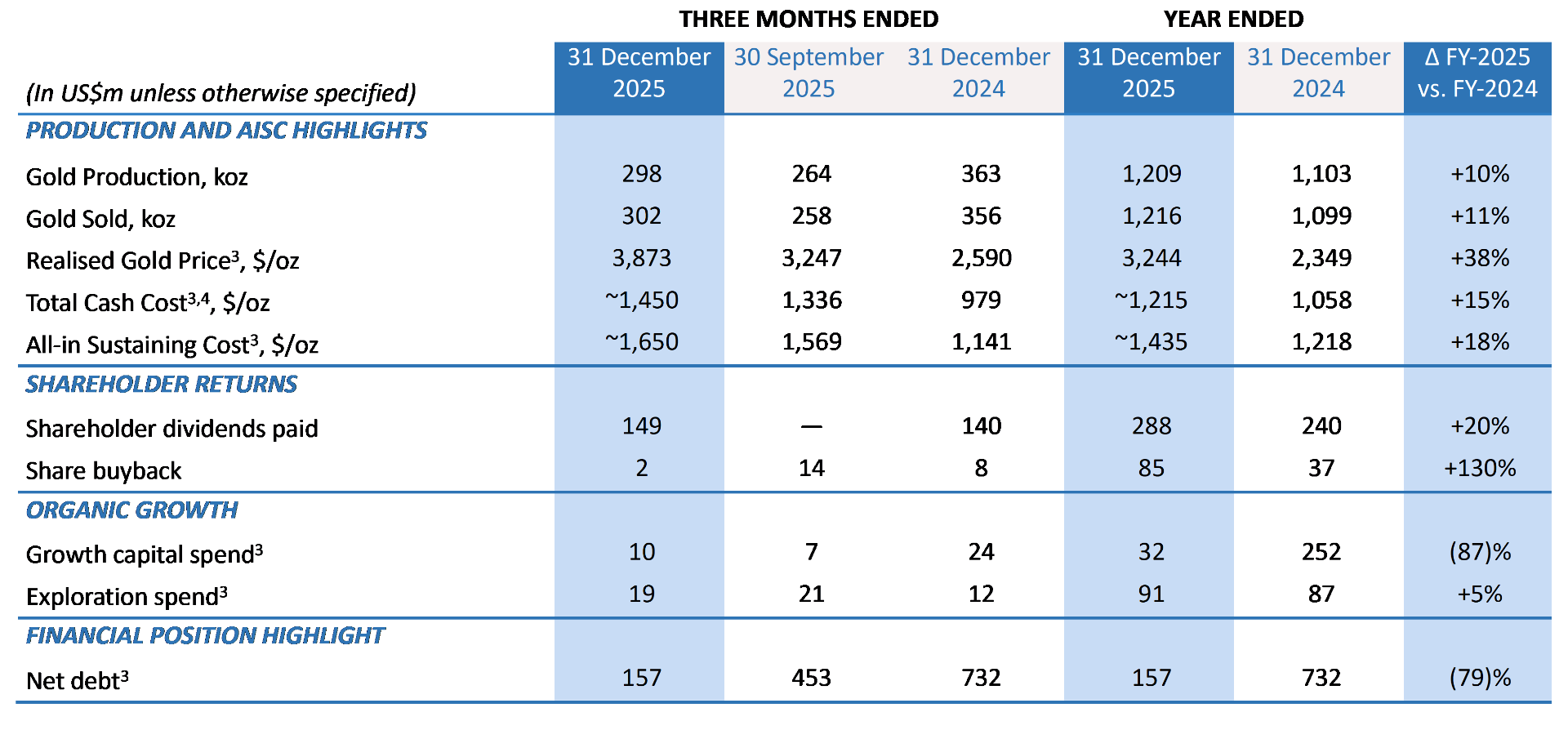 • FY-2025 production of 1,209koz, in the top-half of guidance at an AISC of ~$1,435/oz, within guidance when adjusted for +$128/oz higher royalty costs related to higher gold prices.